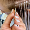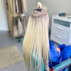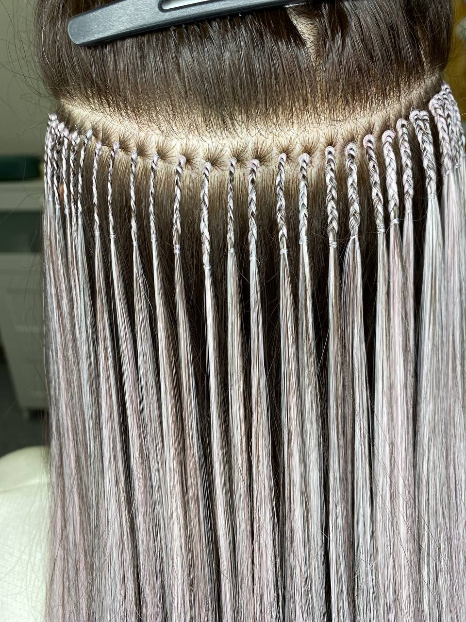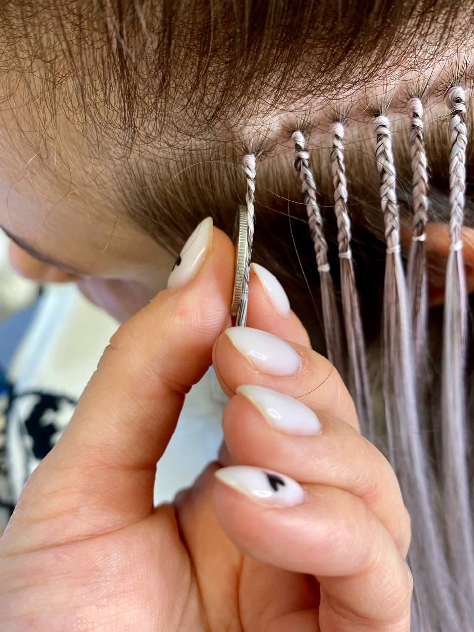 Материал приплетается на маленькие и тонкие косички, на конце узелок, в котором нет своих волос, только термоволокно, прогревается утюжком. Фиксация происходит за счет свойств термоволокна держать форму при нагревании на 180-200 градусов.